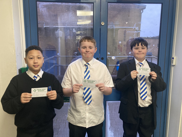 Dario, Jacob and George proudly show off their Green Hero Reward Cards, celebrating their commitment to recycling and helping the environment. Well done boys!
